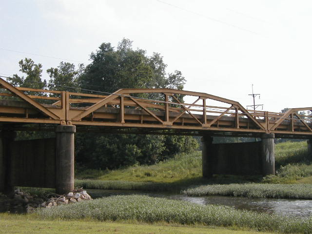 This 3-span truss bridge actually contains five spans, a stringer approach span stands at each end. This bridge was built in 1934, replacing a narrow, poured concrete deck girder bridge which still stands nearby.
