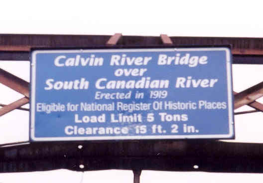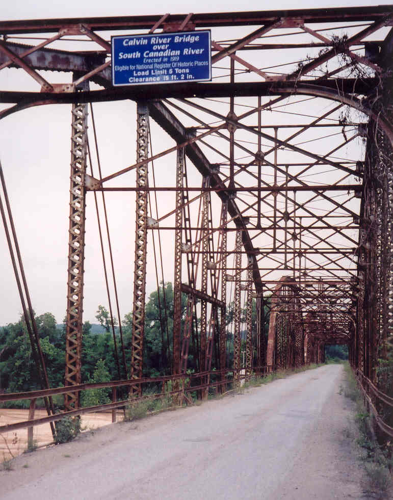 Built by the Missouri Valley Bridge & Iron Co, of Leavenworth Kansas as Oklahoma Federal Aid Project No. 16 in 1919, the Calvin Bridge has carried many travelers across the Canadian River. In 1925, OK 12 was designated to cross the Canadian River via the Calvin Bridge. In 1926, this bridge served US 73 and US75. By 1936, only US 75 was routed across the Calvin Bridge.