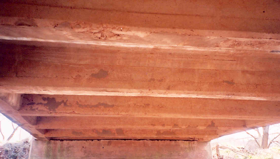 Below, a view of the underside of the deck. Each of the transverse ribs connects to the lower chord at a point where it is intersected by a vertical tie.