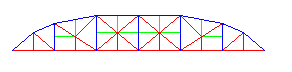 Above, schematic diagram of the 7 panels state standard design, without the horizontal center strut. | Above, the seven panel through Pratt with horizontal strut in center panel. The strut is a nominal members that serves to brace the blue (compression) members. |