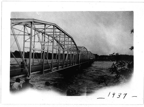Above left, Oklahoma riveted Pratt pony truss. Blue members are in compression, red are in tension. Right, an 80-foot example built in 1930.