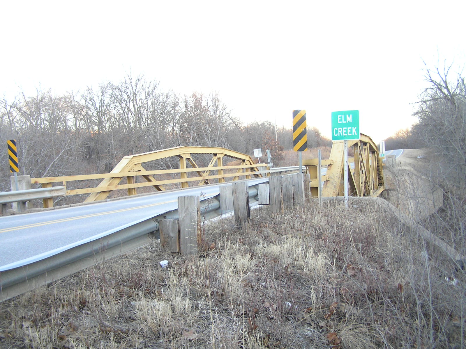 Above, a view of the Elm Creek bridge looking west. Below, a close view along the side of the bridge. Note the concrete wing posts at the ends of the bridge, and the use of wide flanged steel for the web members.