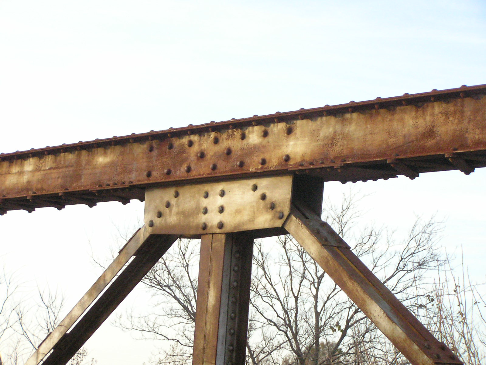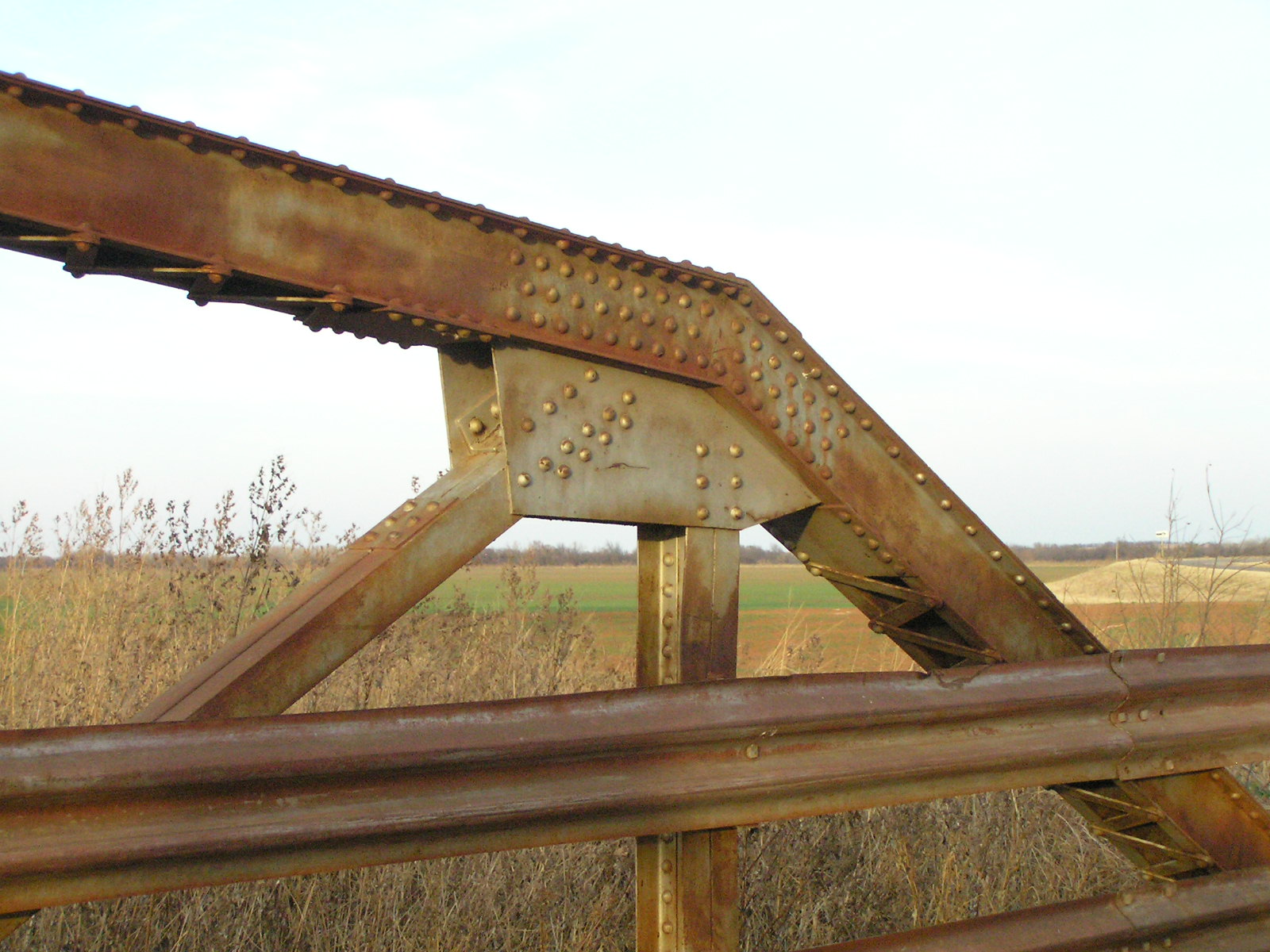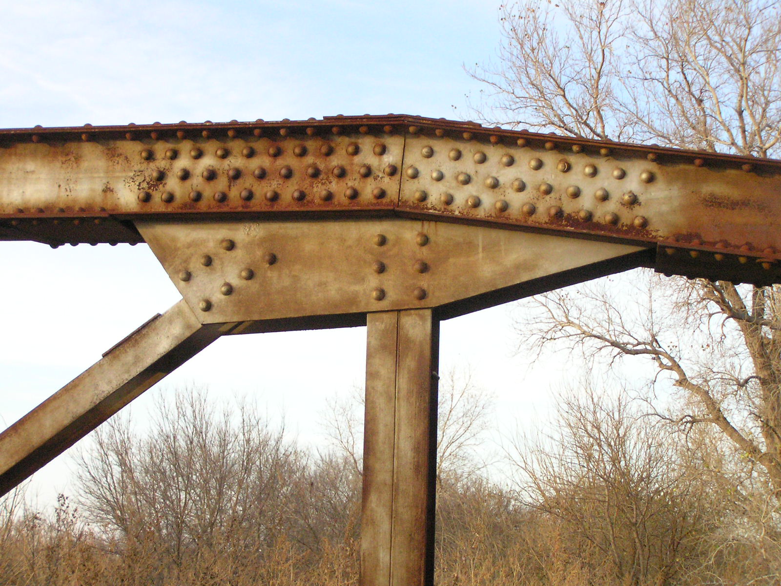 Above, detail of hip connections. Note the extra angle riveted to the tension diagonal. This allows both legs of the angle to be connected to the gusset plate.