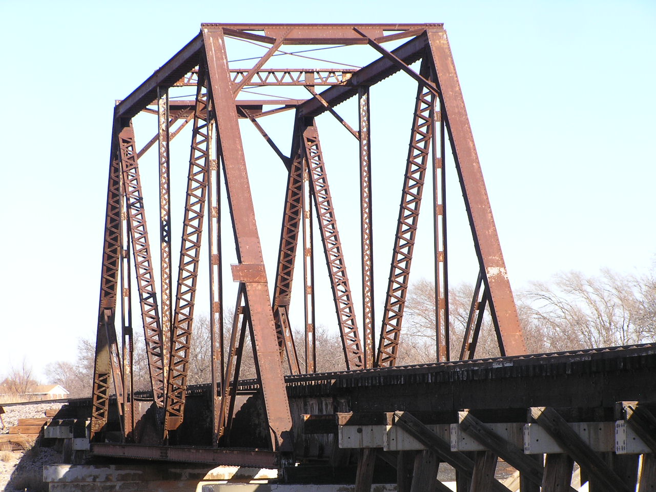 Above, the mainspan. It is an all-riveted through Warren with verticals, or a four-panel through Pratt. The struts which attach to the center of the endposts are called Collinson struts. This bridge was built by the Saint Louis-San Francisco Railroad, commonly known as the Frisco circa 1910.