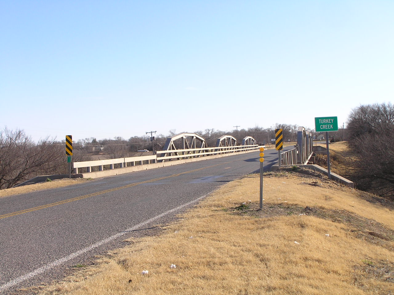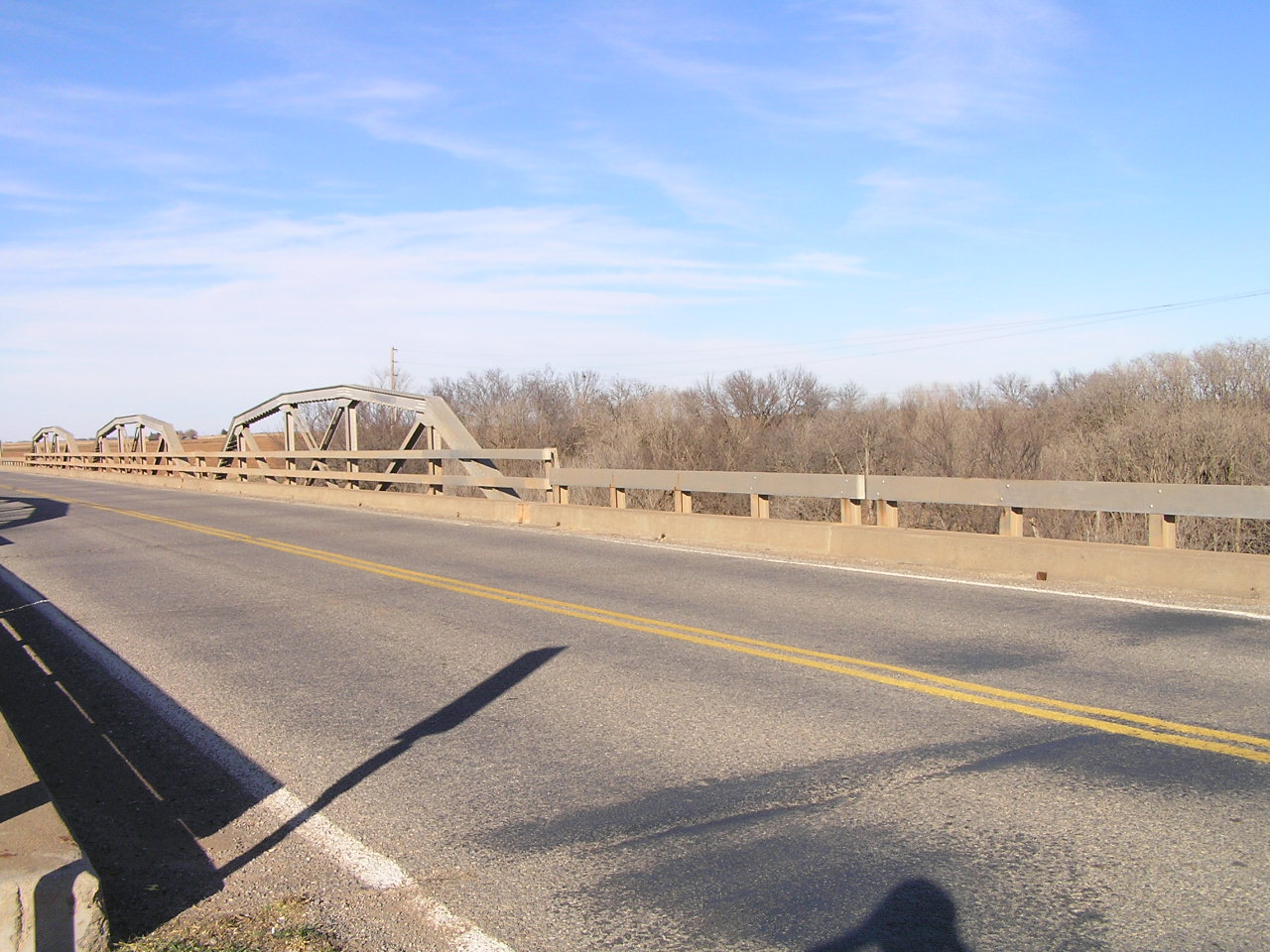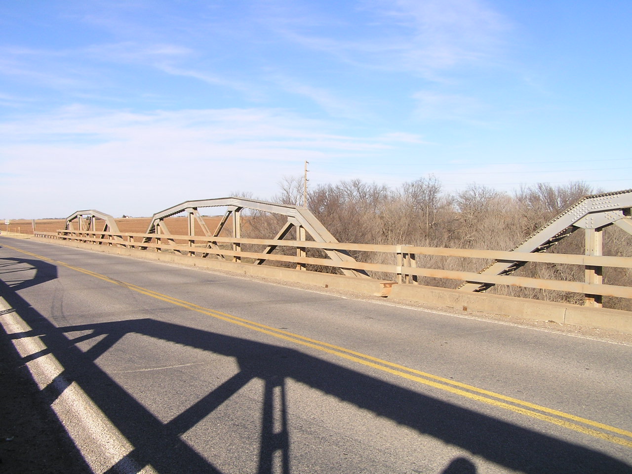 Below, view of the trusses and approach spans. The guard rail used on the approaches was the standard design for highway bridges built in Oklahoma in the late 50's and early 60's. This bridge demonstrates the way in which old bridges would be modernized by upgrade rather than replacement, a course of action rarely used, unfortunately, today.